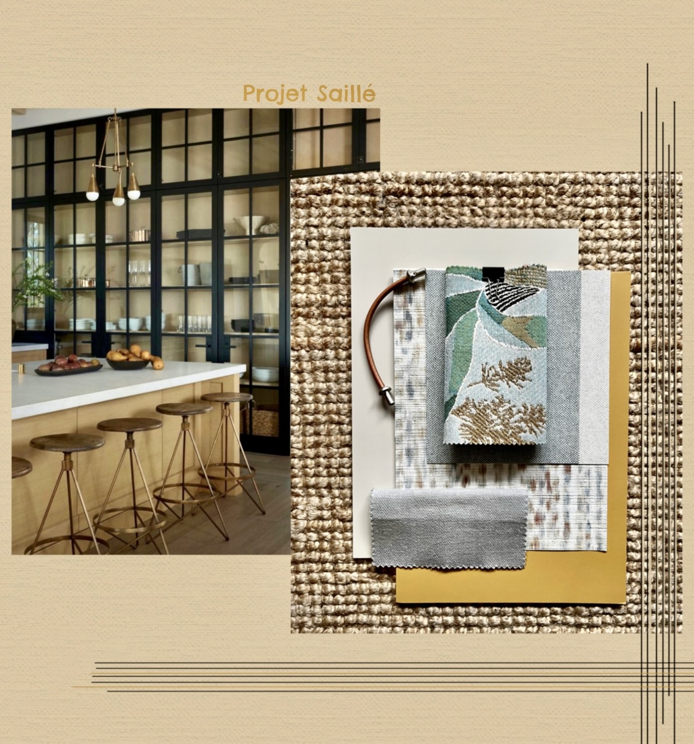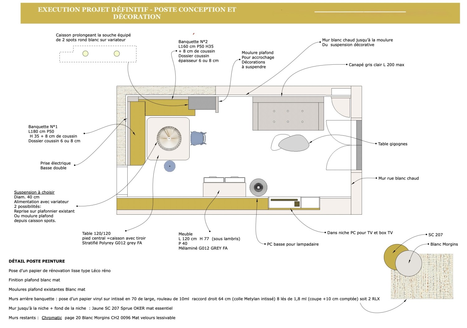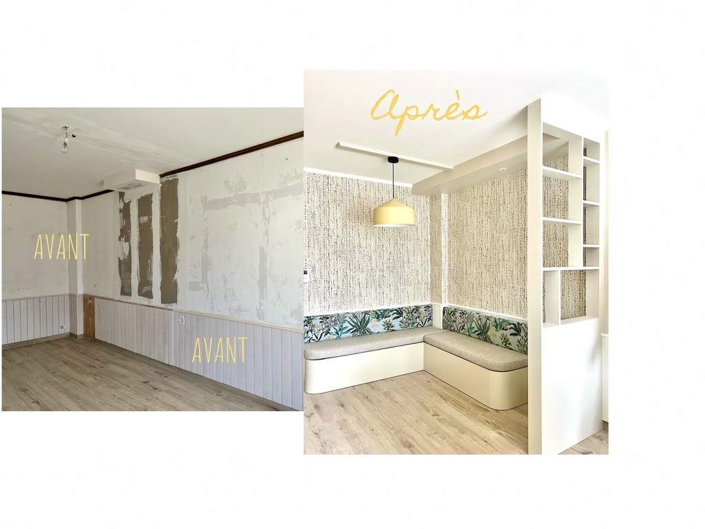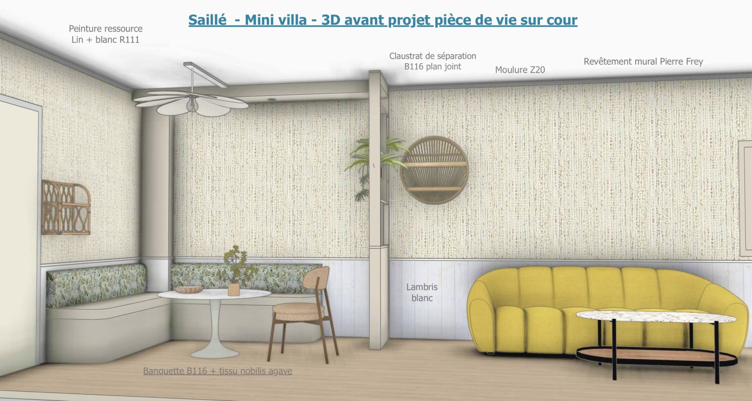 Rénovation d'une micro villa Projet d'agencement et de décoration de l'espace à vivre Planche ambiance Nouvelle implantation Matériaux sélectionnés Croquis mobilier sur mesure avant/après